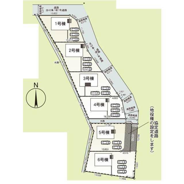 号棟番号:6号棟 22条区域 建物面積に別途ルーフバルコニー約9.72平米有り 土地面積に協定通路部分(路地状部分)約41.64平米を含む 敷地内に電柱有り |